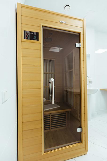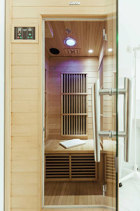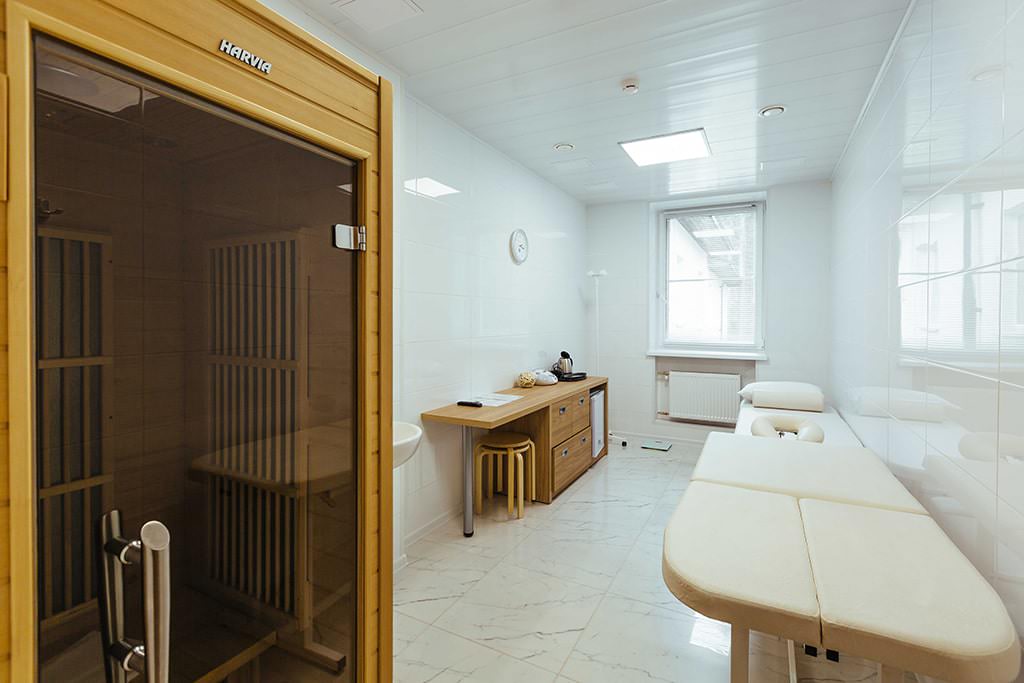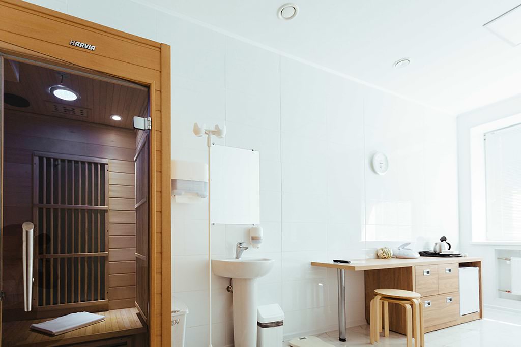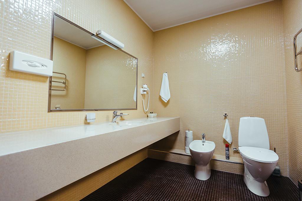 Площадь номера - 50 кв.м. 2 осн. места. 1 доп. место. Мебель: вешалка, зеркало, кровать двуспальная, прикроватные тумбочки, стол, стулья, шкаф. Оборудование: компьютер, кондиционер, сейф, телевизор, телефон, холодильник, чайный набор посуды, электрочайник. Санузел: 2 санузла, биде, сауна (Инфракрасная сауна), с душем, тапочки, туалетные принадлежности, фен, халат. Сервис: Wi-Fi бесплатно, карточная система замков, смена полотенец, смена постельного белья, уборка номера.